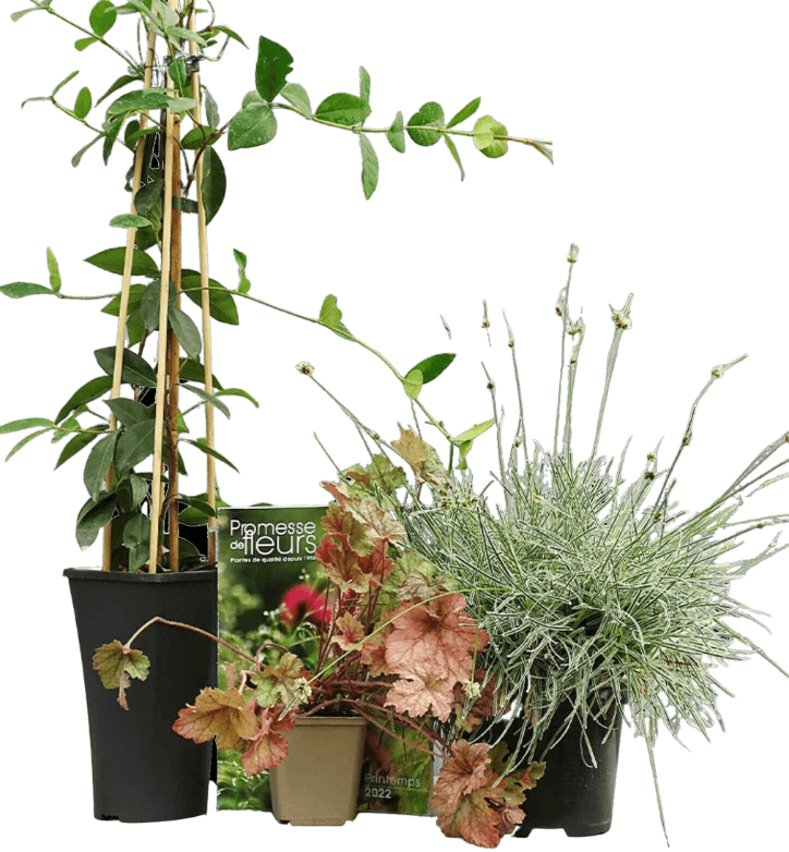 - oppure 1 pianta rampicante in vaso e 2 piante perenni in vaso.